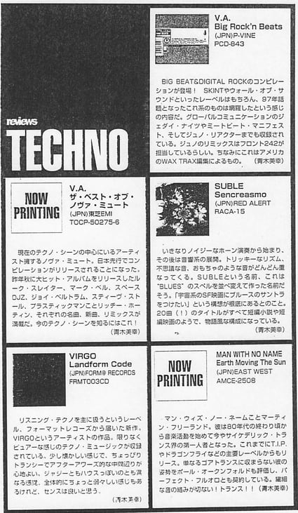 VIRGO's "Landform Code" was introduced in the "MIX-News-Corner" of the March 1998 issue of Sound & Recording Magazine. "The songs are the same as the label color, high quality listening techno that is familiar to Autechre and Plaid. The reverb feeling makes you feel the pureness of the early Aphex Twin, but it is a good board that is not just imitation. They are planning to release or expand overseas. Don't neglect to check. "
