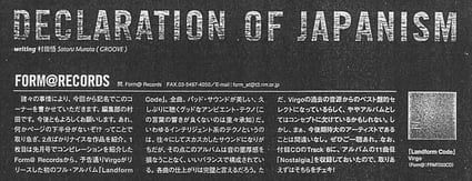 "Nostalgia" from "Landform Code" of VIRGO was recorded on the CD attached to the March 1998 issue of GROOVE magazine. Of course, because it is linked with DECLARA TIO OF JAPANISM, the label is also introduced. Furthermore, from this issue, I will be in charge of writing the TECHNO section of DISC REVIEW, which introduces VIRGO's album.