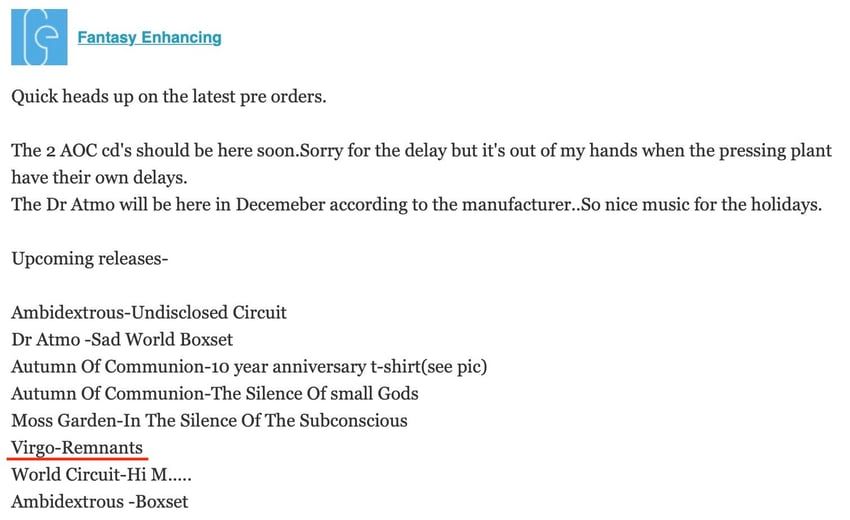 I was relieved that VIRGO's second album REMNATNS was still included in the lineup for the upcoming release.