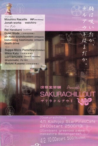 2000年4月1日に東京吉祥寺で開催されたアンビエントパーティ。正確には第一部が4月1日の吉祥寺スターパインズカフェで、4月2日が井の頭公園だったらしい。...