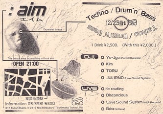 A Techno and Drum'n'Bass event called Aim (: aim) held in 1997 in Ikebukuro, Tokyo. DJ set and live. Yu-Jyu, who participated with FORM @ RECORDS on his back, is also the organizer of this event and also provides music as MAG-NET-WALKER. By the way, the Love Sound System credited to LIVE is a unit of Ayako Tsunura and Juliano Fujiwara. Juliano is also credited to DJs. I think I released a CD at that time. Eisei Yorimitsu (FORM@ RECORDS) (In Japanese)...